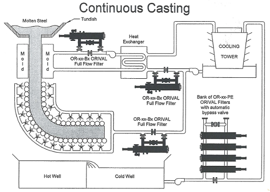 The schematics illustrate the four basic application types for steel mills: continuous casting, blast furnace, hot rolling, and cold rolling.